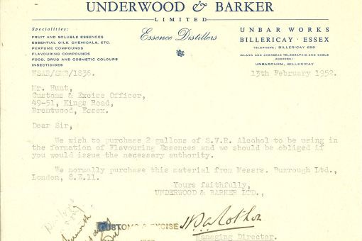This 1952 correspondence from Underwood & Barker offers a fascinating glimpse into the company’s early operations and its role within the regulated supply of alcohol for flavour production. It highlights the longstanding heritage of expertise in essence distillation and the close relationship with authorities that underpinned industry standards at the time.